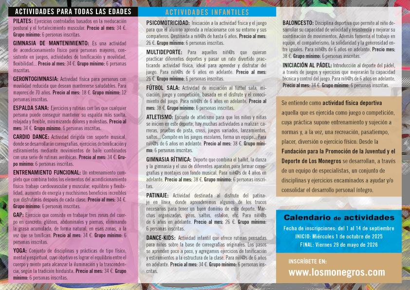 La atractiva oferta comprende 17 propuestas dirigidas a todas las edades que comenzarán el 1 de octubre y concluirán el 29 de mayo de 2026. En concreto, la programación incluye actividades infantiles como psicomotricidad, multideporte, fútbol sala, atletismo, gimnasia rítmica, patinaje, dance-kids, baloncesto e iniciación al pádel, así como pilates, gimnasia de mantenimiento, gerontogimnasia, espalda sana, cardio dance, entrenamiento funcional, GAP y yoga para adultos.