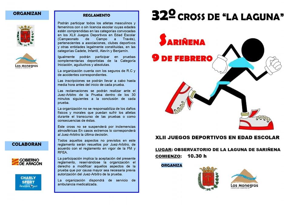 El 32º Cross de La Laguna tendrá lugar en Sariñena el domingo 9 de febrero a partir de las 10.30 horas. La prueba pertenece a los 42 Juegos Deportivos en Edad Escolar de Aragón (Campeonato de Campo a Través) y se celebrará en el circuito que rodea la Laguna de Sariñena. Organizado por el Ayuntamiento de Sariñena y la Comarca de Los Monegros, a través de la Fundación para la Promoción de la Juventud y el Deporte de Los Monegros, cuenta con la colaboración del Gobierno de Aragón y Charly Sport.
